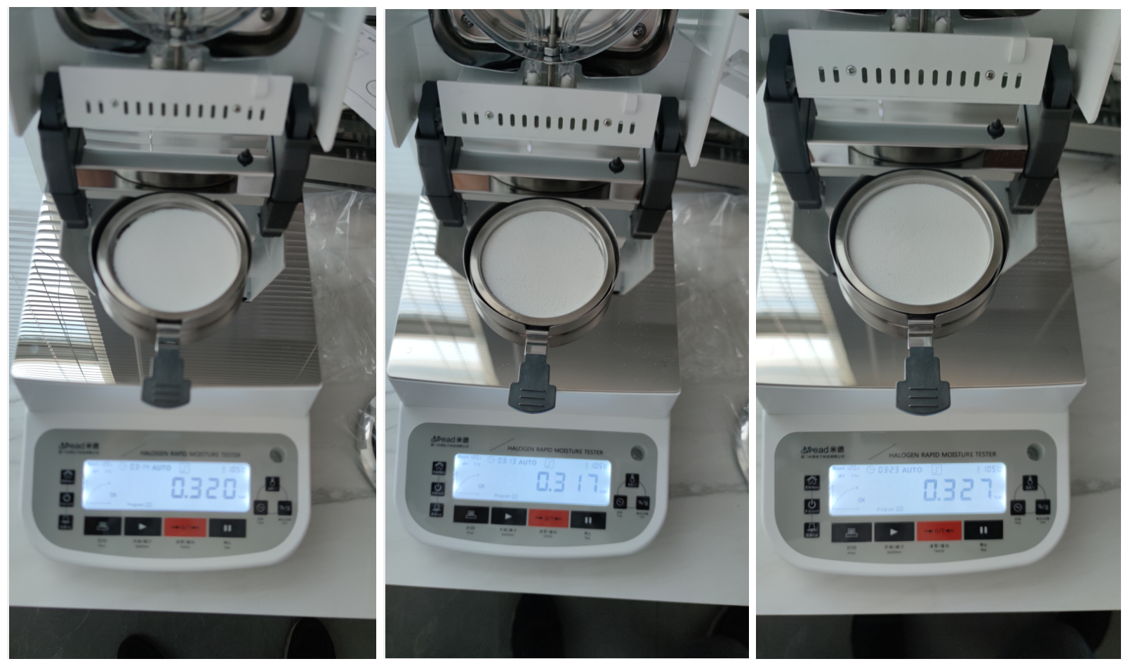5. 復位儀器,待儀器冷卻至40℃以下后,再取4g樣品鋪在樣品盤上,重復上述測試步驟;測試結束后得出第三組數據,顯示樣品的水分含量為0.327%;數據基本相同,排除了一、二組測試的小概率巧合,確認測定結果準確。