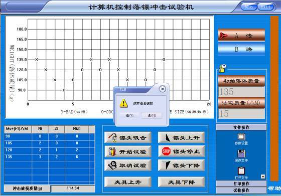 試驗開始時,首先選擇試驗方法,估計一個初始質量和Δm值,進行試驗,如果第一個試樣破損,用砝碼Δm減少落體質量;如果第一個試樣不破,須用砝碼Δm增加落體質量依此進行試驗。總之,利用砝碼減少或增加落體質量,取決于前一個試樣是否破損。20個試樣試驗后,計算破損總數N,如果N等于10,試驗完成;如果N小于10,補充試樣后,繼續試驗直到N等于10;如果N大于10,補充試樣后,繼續試驗直到不破損的總數等于10為止,最后由系統自動計算沖擊結果。