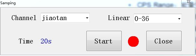 首先選中需要標定的通道和線性。如上圖4.3所示:通道為選擇jiaotan(根據現場可以選擇新建的通道)?;然后選擇線性為:0-36(根據實際情況選擇);點Start按鈕,開始啟動取樣。啟動后指示燈變為綠色,Time 為采樣倒計時,當此數據為0時表示取樣完成。最后點Close關閉窗體按鈕完成取樣。