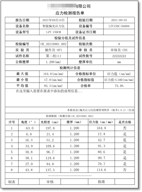 - 檢測報告輸出:使用“PDF”格式或“XPS”格式文件輸出不可更改的檢測報告,檢測報告中包含公司信息、檢測信息、設備信息、樣品信息、批次的最大值、最小值、平均值和合格率。